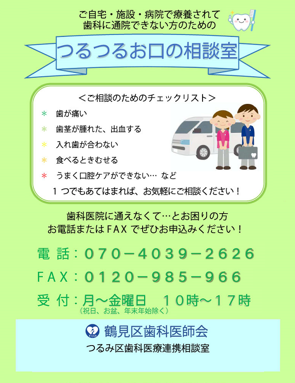 鶴見区歯科医師会では、歯科医院へ通院したくても、障がいや病気、高齢のために通院ができない方のための相談窓口“つるつるお口の相談室”を開設いたしました。